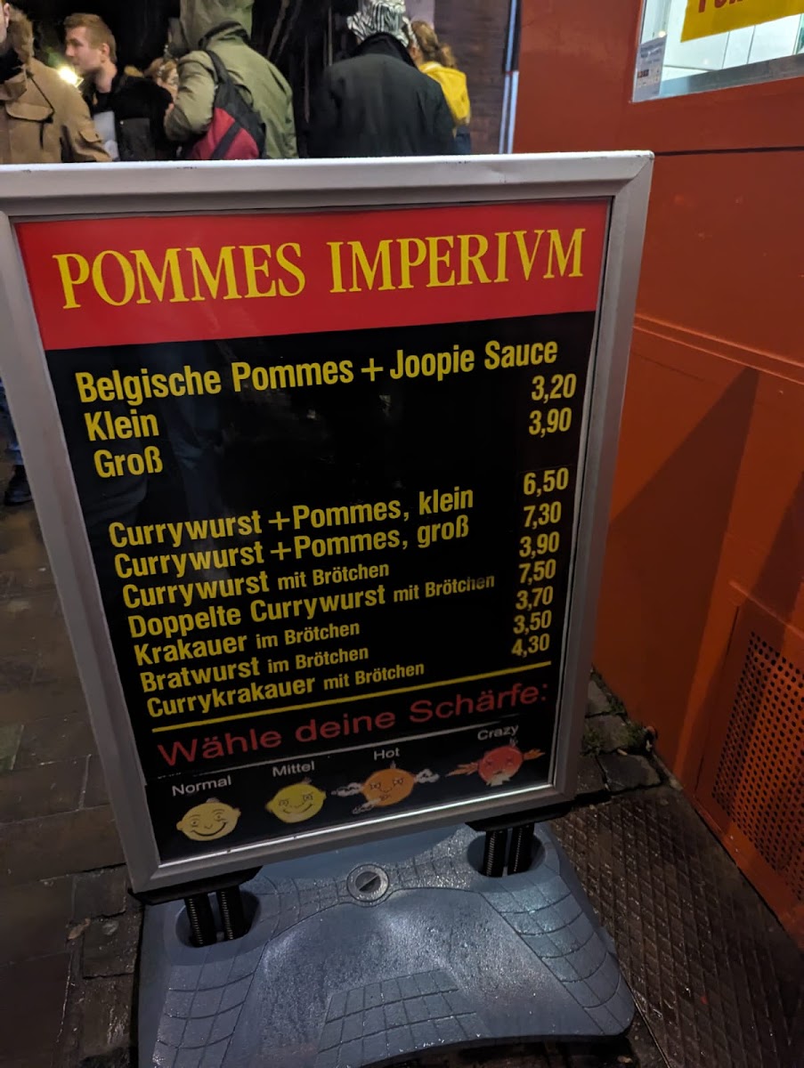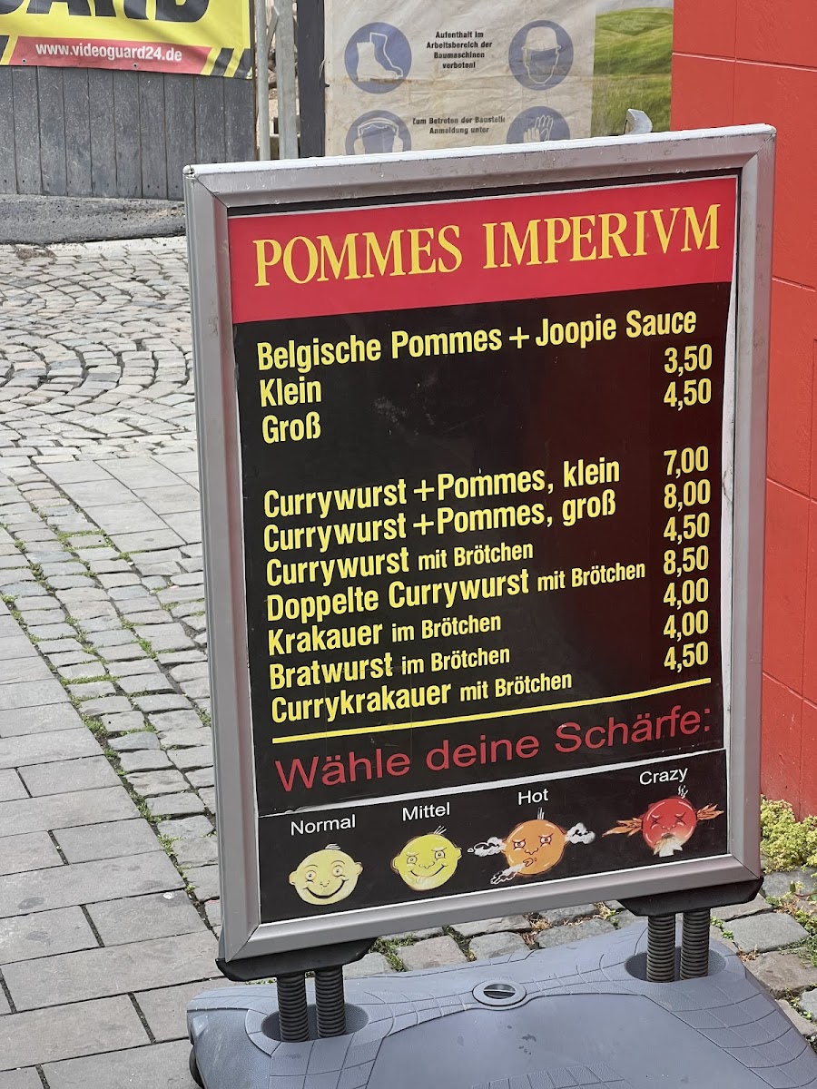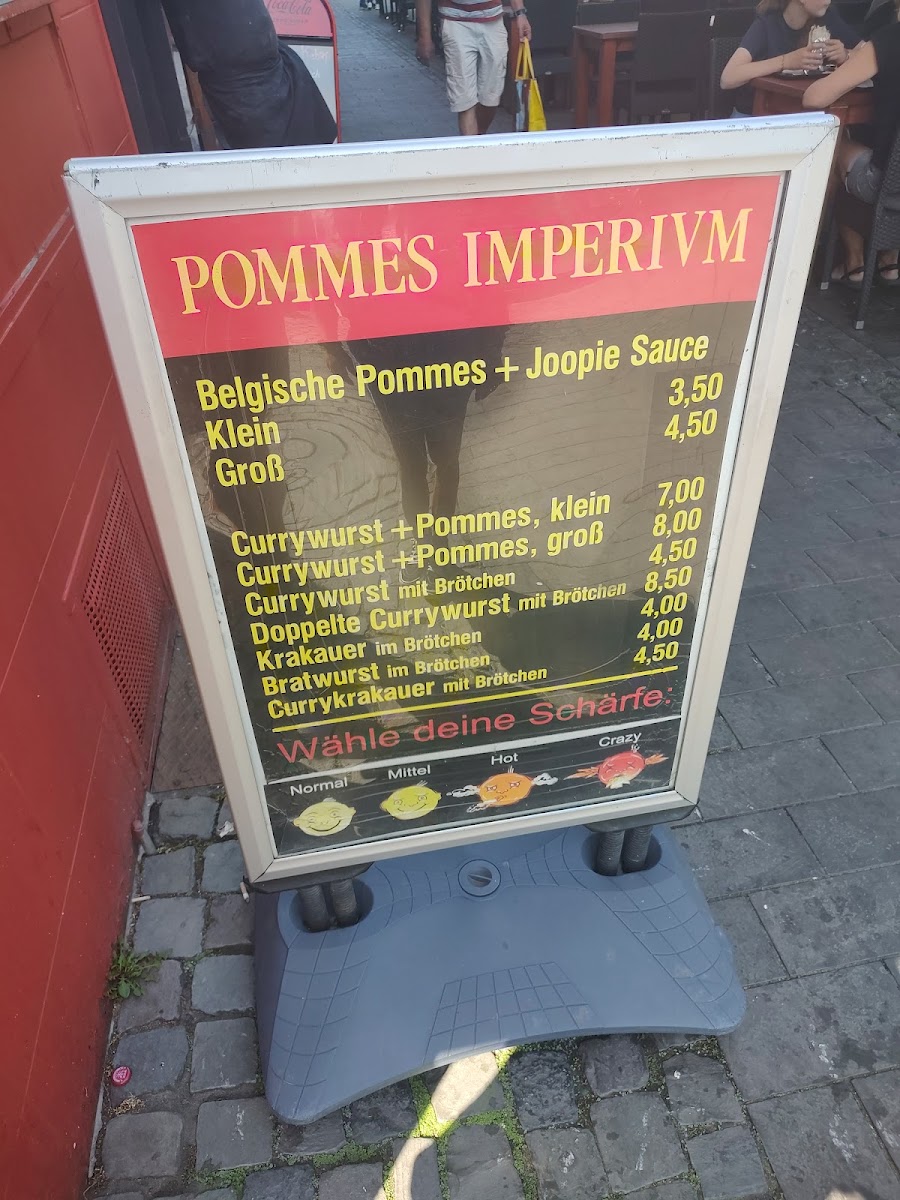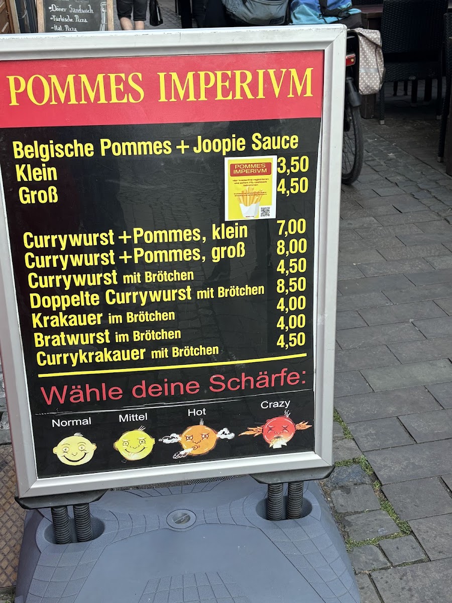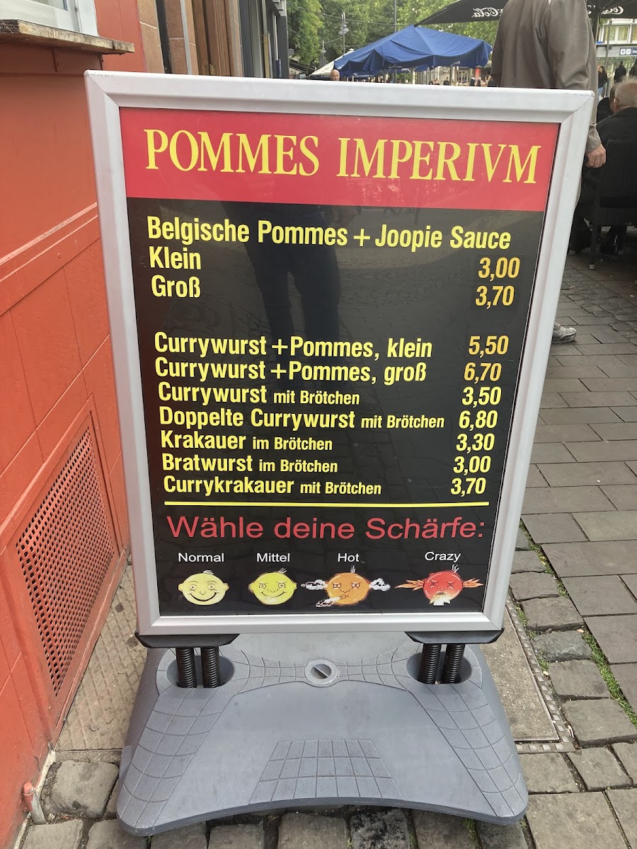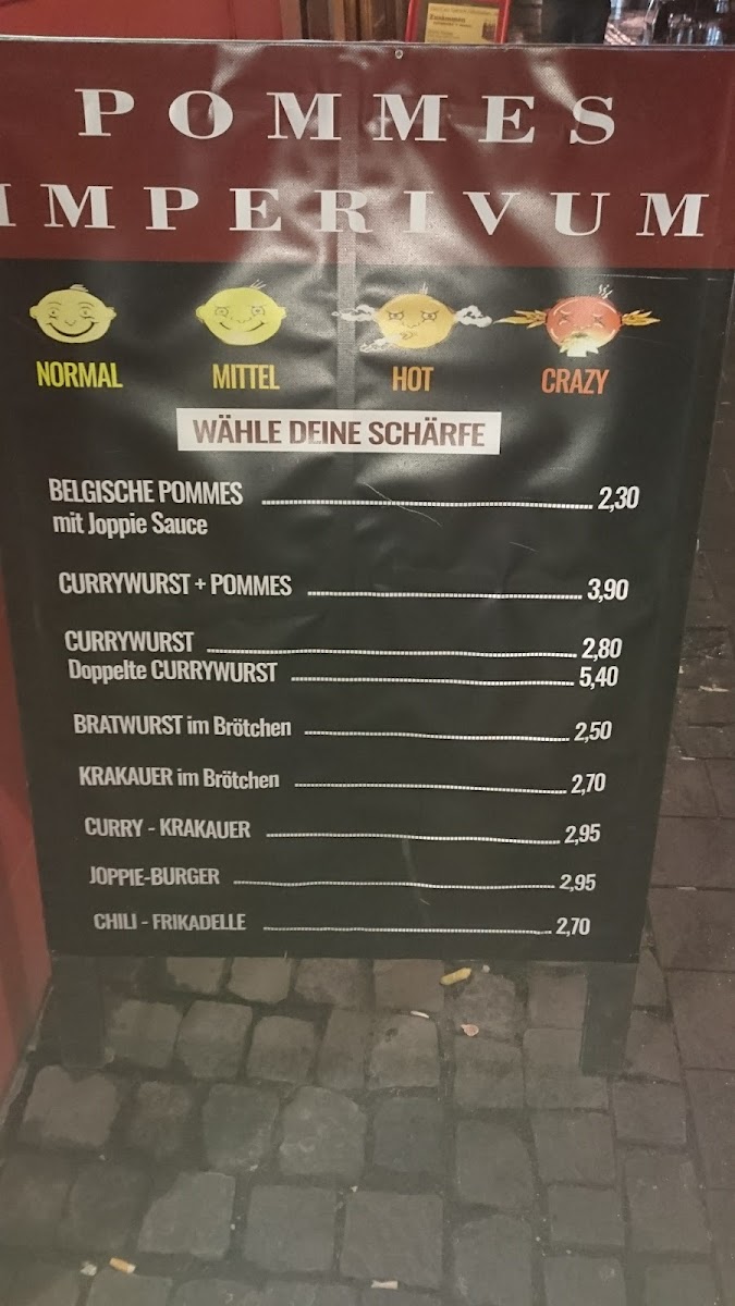 The menu at Pommes Imperium offers a delightful selection of classic German fast food, perfect for a satisfying meal at any time of day. With a focus on hearty and flavorful dishes, the offerings cater to a variety of tastes, especially for fans of traditional German street food. The Doppelte Currywurst, a hearty double serving of the beloved currywurst, is a standout option for those craving a rich, savory experience. For something more straightforward, the Bratwurst Im Brötchen serves up a perfectly grilled bratwurst nestled in a soft roll, a simple yet satisfying choice. If you're in the mood for something with a bit more flair, the Portion Pommes Frites Currywurst combines crispy fries with the iconic currywurst, delivering a classic comfort food combo. The Bockwurst Mit Pommes Fritten Und Brötchen rounds out the menu with a satisfying mix of bockwurst sausage, fries, and a roll, making it an ideal choice for those who enjoy a well-rounded meal. Each dish is prepared with care, ensuring a delicious taste of German fast food that's both comforting and fulfilling.